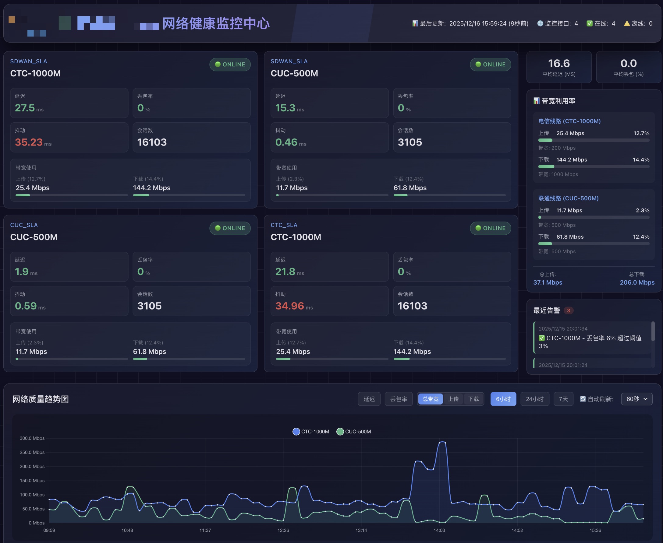 每个接口独立卡片显示延迟、丢包率、抖动、会话数、带宽等完整指标。